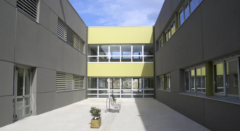 ProarquitecturaP r o j e c t e d e n o v a e d i f i c a c i ó d e s t i n a t a ú s e d u c a t i u ( i n s t i t u t d e n s e n y a m e n t s e c u n d a r i m é s c o l · l e g i d e d u c a c i ó i n f a n t i l i p r i m à r i a ) . R e s o l t a t r a v é s d e 3 c o s s o s d e p l a n t a r e c t a n g u l a r ; e l s d o s p r i n c i p a l s ( d e p l a n t a b a i x a m é s u n a ) s e s e p a r e n e n t r e s i p e r ò e s c o n n e c t e n p u n t u a l m e n t a n i v e l l d e p l a n t a b a i x a m e n t r e e l t e r c e r ( q u e c o n t é e l g i m n à s ) e s c o n s t r u e i x e n u n a c o t a s u p e r i o r a d a p t a n t - s e a l d e s n i v e l l d e l s o l a r . L a s i n g u l a r i t a t d e l p r o j e c t e r a d i c a e n l a s e v a e s t r u c t u r a p r e f a b r i c a d a i e n c o n s e q ü è n c i a e n e l t e m p s d e x e c u c i ó . L e s t r u c t u r a e s t à f o r m a d a p e r p i l a r s d e s e c c i ó q u a d r a d a ( 4 0 x 4 0 ) a m b m è n s u l e s p e r a l s u p o r t d e l e s j à s s e r e s p r e f a b r i c a d a d e s e c c i ó r e c t a n g u l a r ( 4 0 x 6 0 i 4 0 x 6 5 ) s o b r e l e s q u a l s d e s c a n s e n p l a q u e s a l v e o l a r s d e d i f e r e n t e s p e s s o r e n f u n c i ó l a l l u m a s a l v a r ( 2 5 + 5 , 3 0 + 5 o 4 0 + 5 e n e l c a s d e l g i m n à s e d i f i c i d e m a j o r l l u m l l i u r e ) . N o m é s e s r e s o l e n i n s i t u l e s e s c a l e s , j a s i g u i n d e f o r m i g ó ( i n t e r i o r ) o e s t r u c t u r a m e t à l · l i c a ( e x t e r i o r s ) .